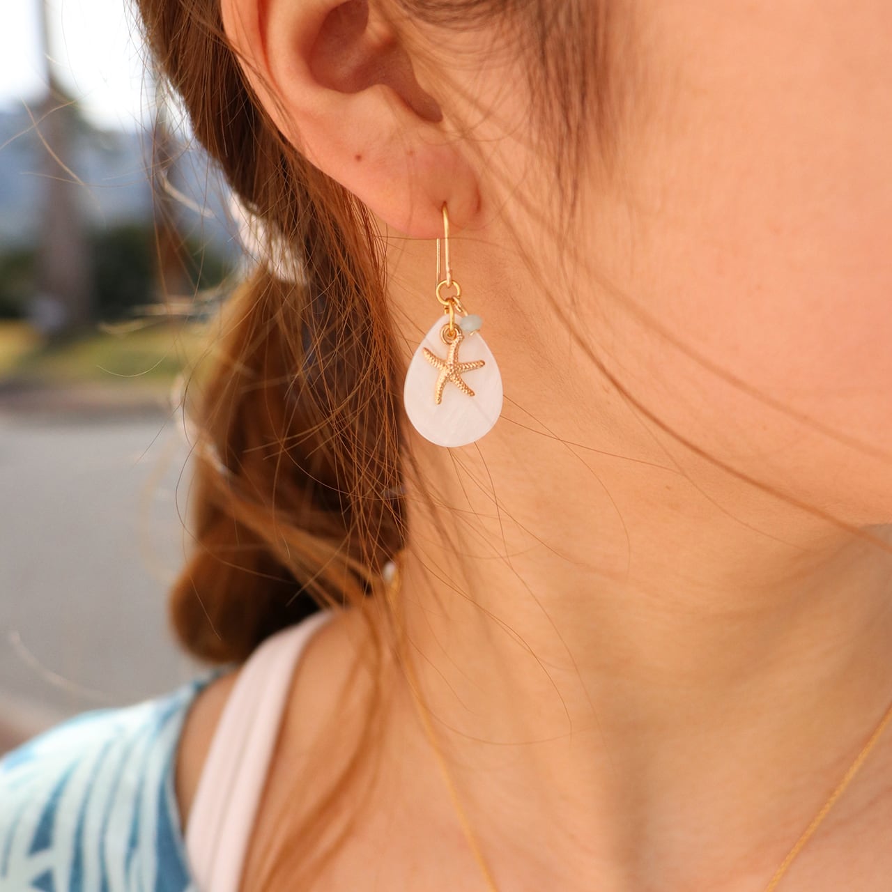 しずく型の天然シェルにシェルとスターフィッシュをアシンメトリーに組み合わせた可愛いピアス。ホワイトシェルとゴールドの組み合わせで上品にお顔を引き立てます。