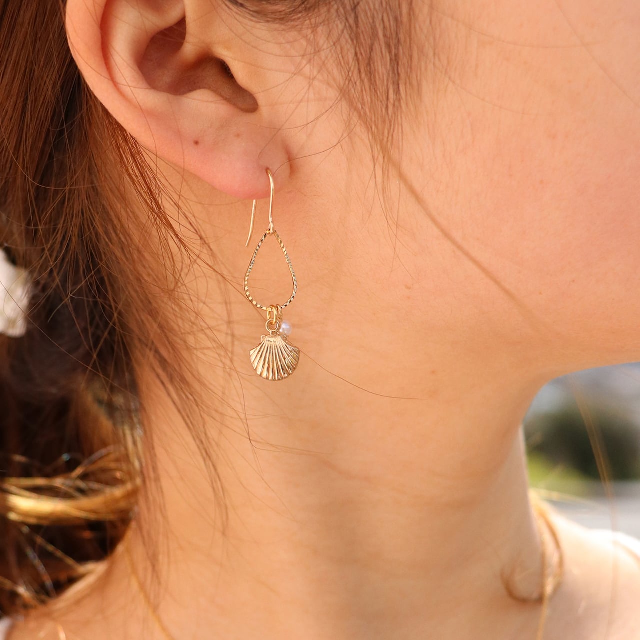 しずく型のミニフープにアシンメトリーのシェルとパールを組み合わせました。華奢なイメージで、コーディネートしやすいサイズ感の可愛らしいピアスです。